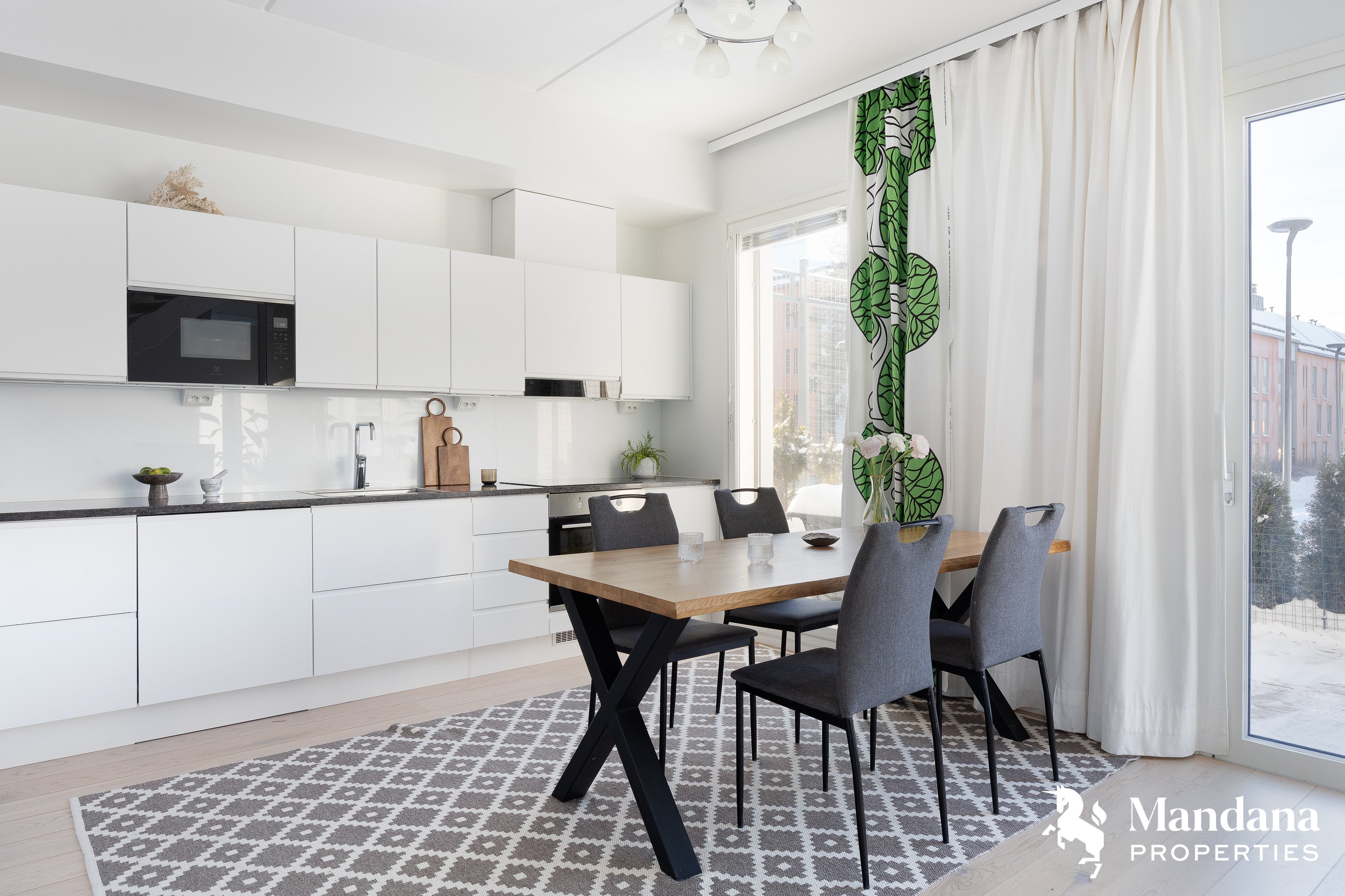 Materiaalivalinnat ovat laadukkaita ja ajattomia: tammiparkettilattiat, tyylikkäästi laatoitetut märkätilat sekä moderni keittiö integroiduilla kodinkoneilla ja kivitasoilla. Olohuoneen ilmalämpöpumppu lisää asumismukavuutta eri vuodenaikoina.