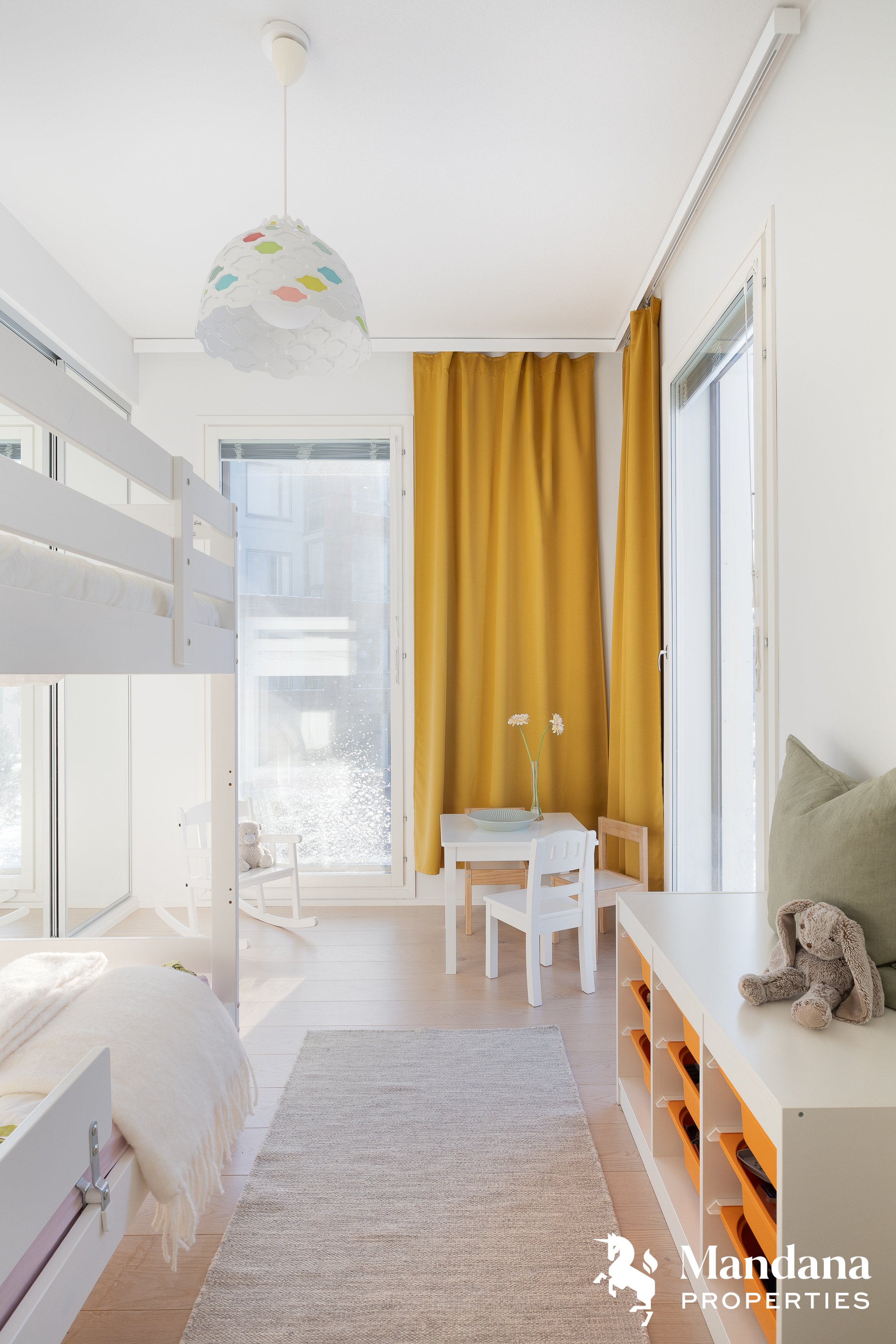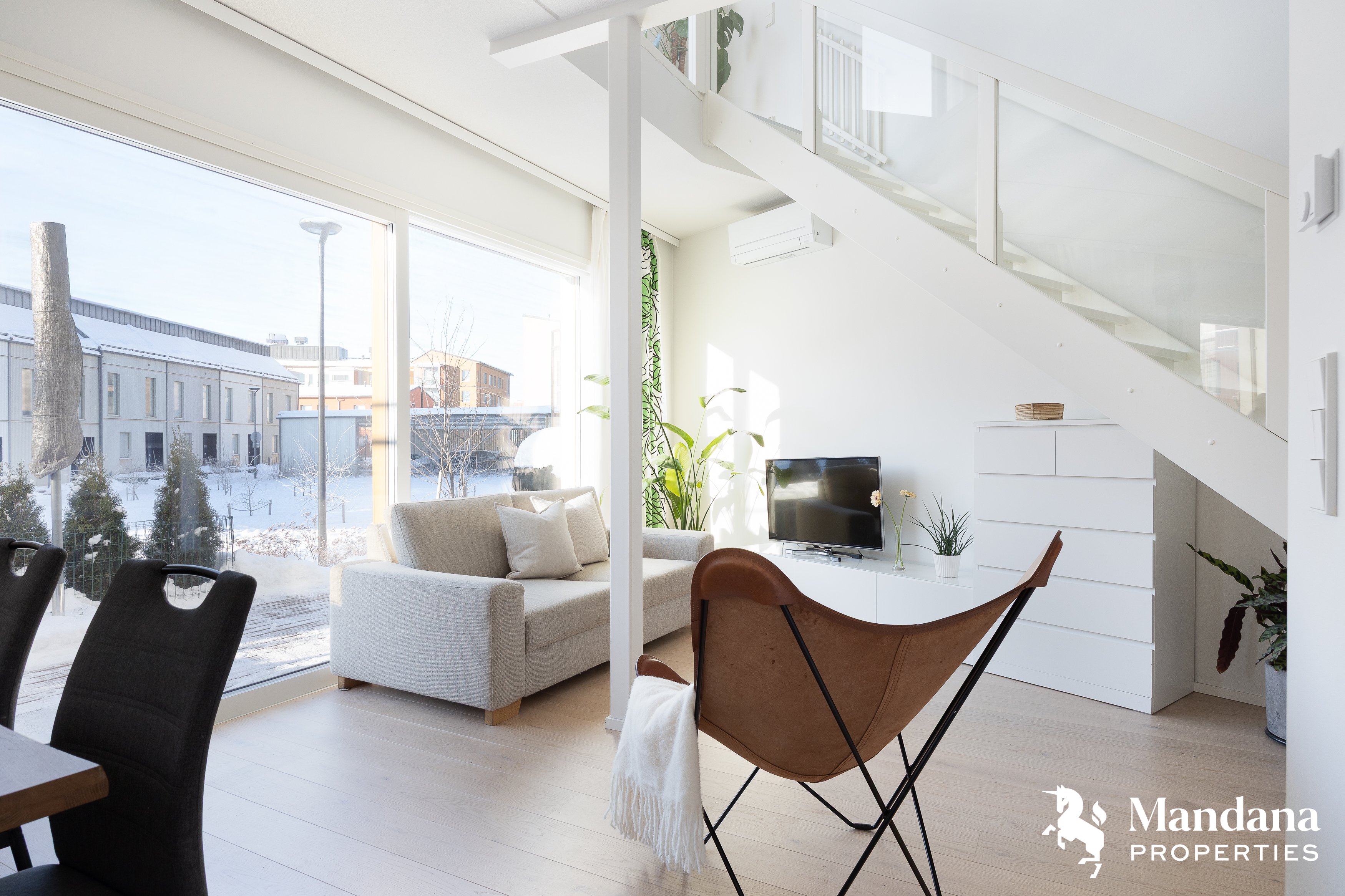 Asunnon suuret ikkunat tuovat runsaasti luonnonvaloa. Olohuone ja keittiö muodostavat viihtyisän kokonaisuuden, josta on käynti koko huoneiston levyiselle terassille. Alakerrasta löytyy lisäksi yksi makuuhuone ja erillinen wc. Yläkerrassa sijaitsevat kaksi makuuhuonetta, tilava kylpyhuone ja sauna.