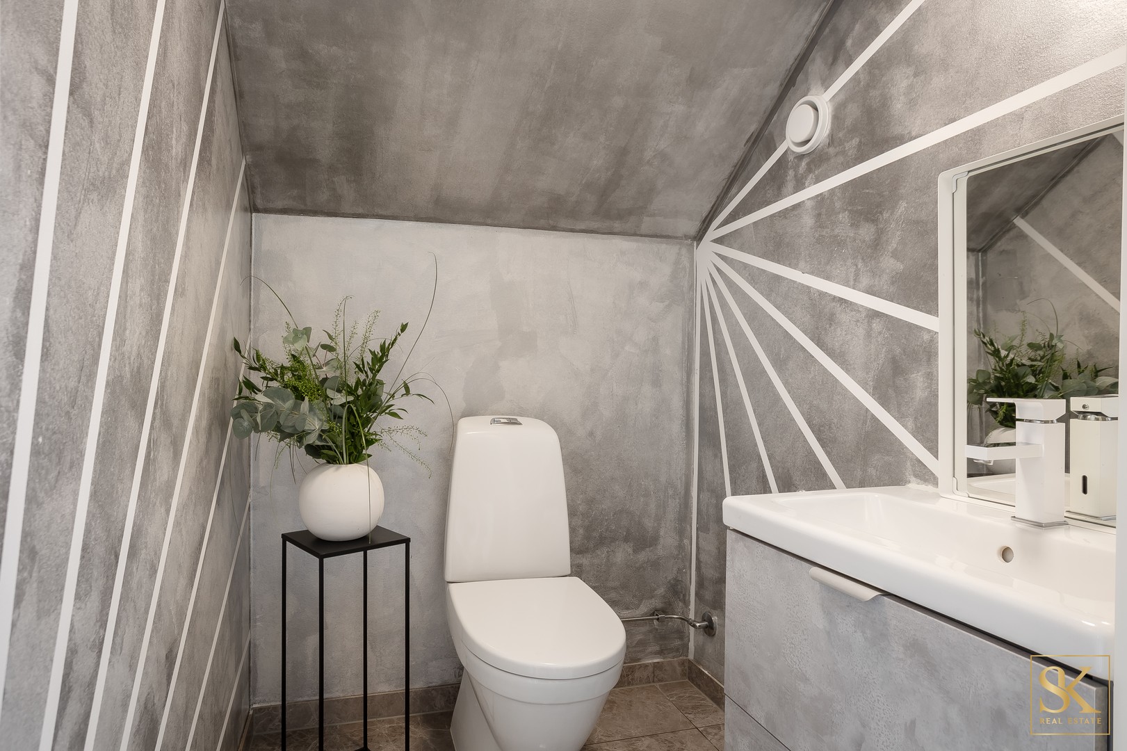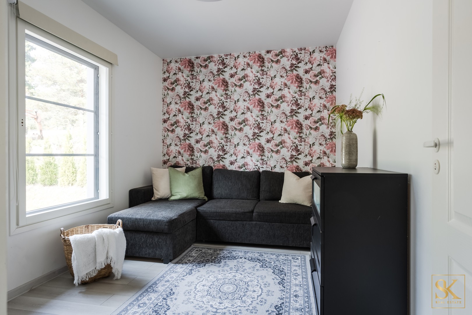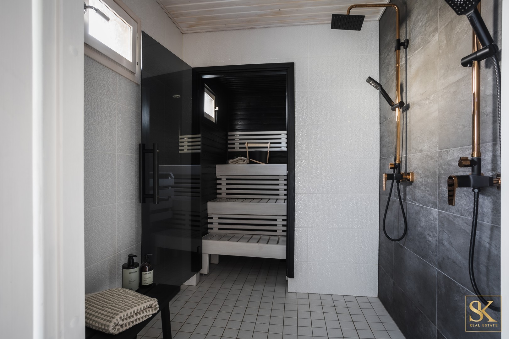 Alakerrasta löytyy myös kaksi makuuhuonetta, pesuhuone kahdella suihkulla, tunnelmallinen sauna sekä erillinen wc. Kodinhoitohuone omalla sisäänkäynnillä helpottaa arjen sujuvuutta ja toimii loistavasti esimerkiksi kuraeteisenä.