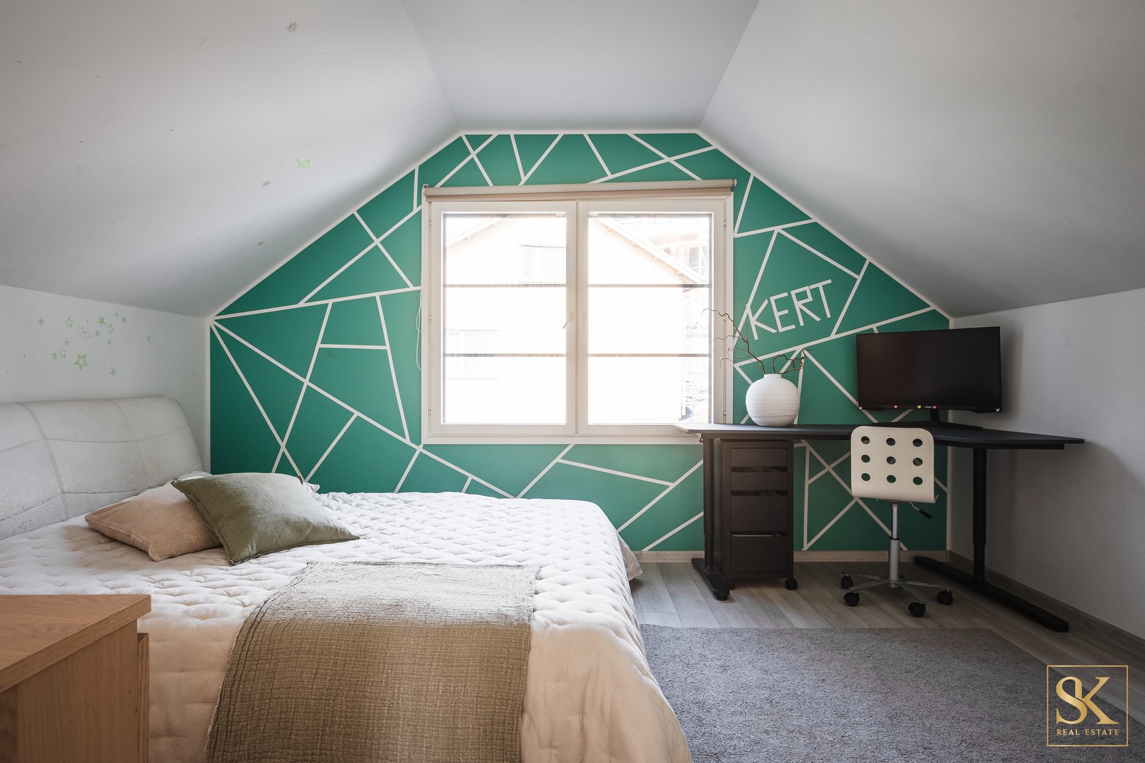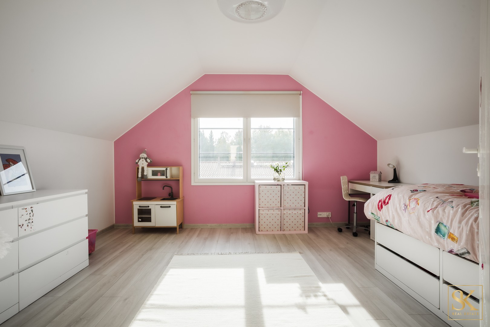 Yläkerta tarjoaa kaksi tilavaa makuuhuonetta, aulatilan, joka soveltuu hyvin vaikkapa oleskelu- tai työtilaksi, sekä kätevän vaatehuoneen ja erillisen wc:n.