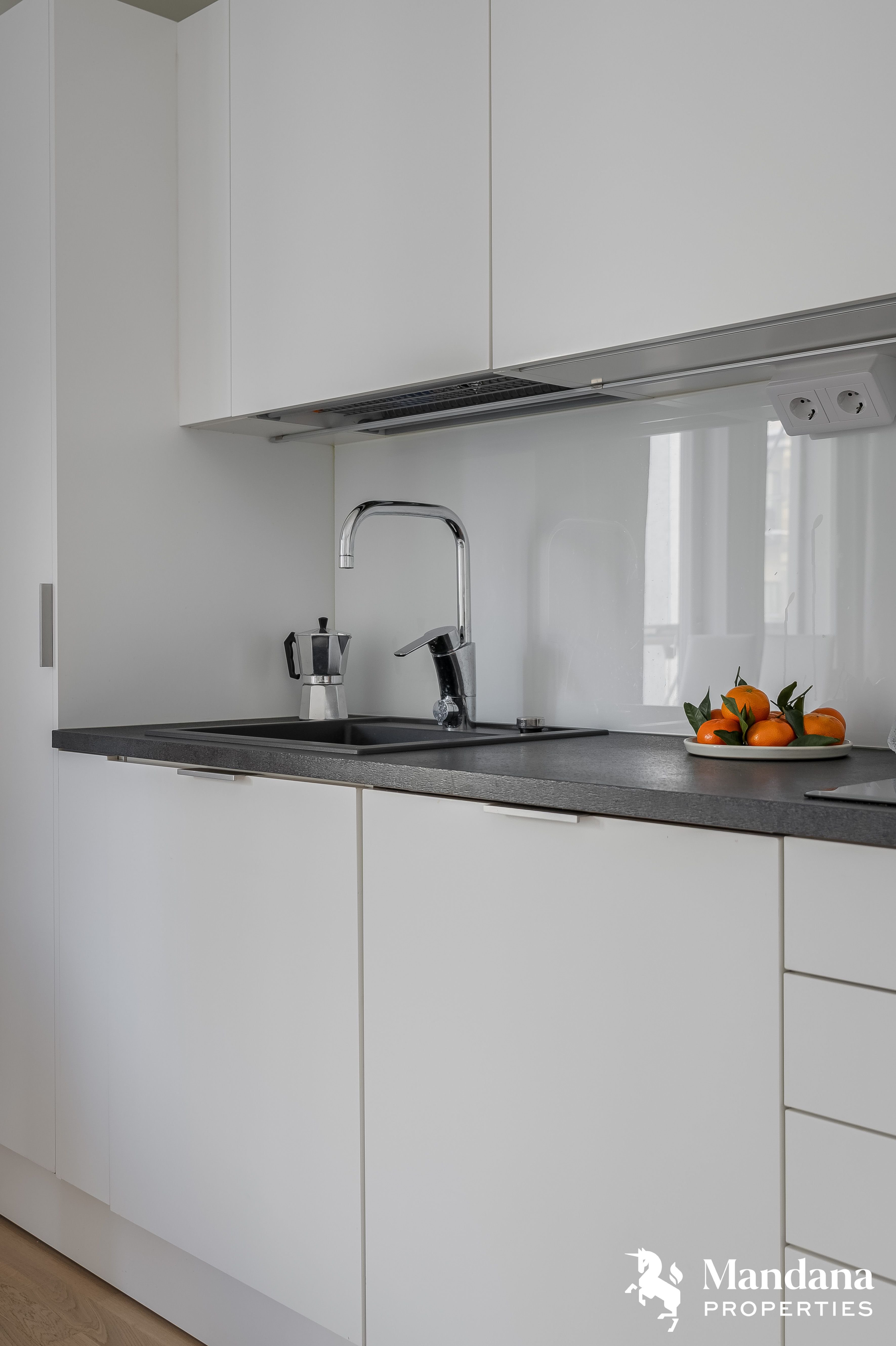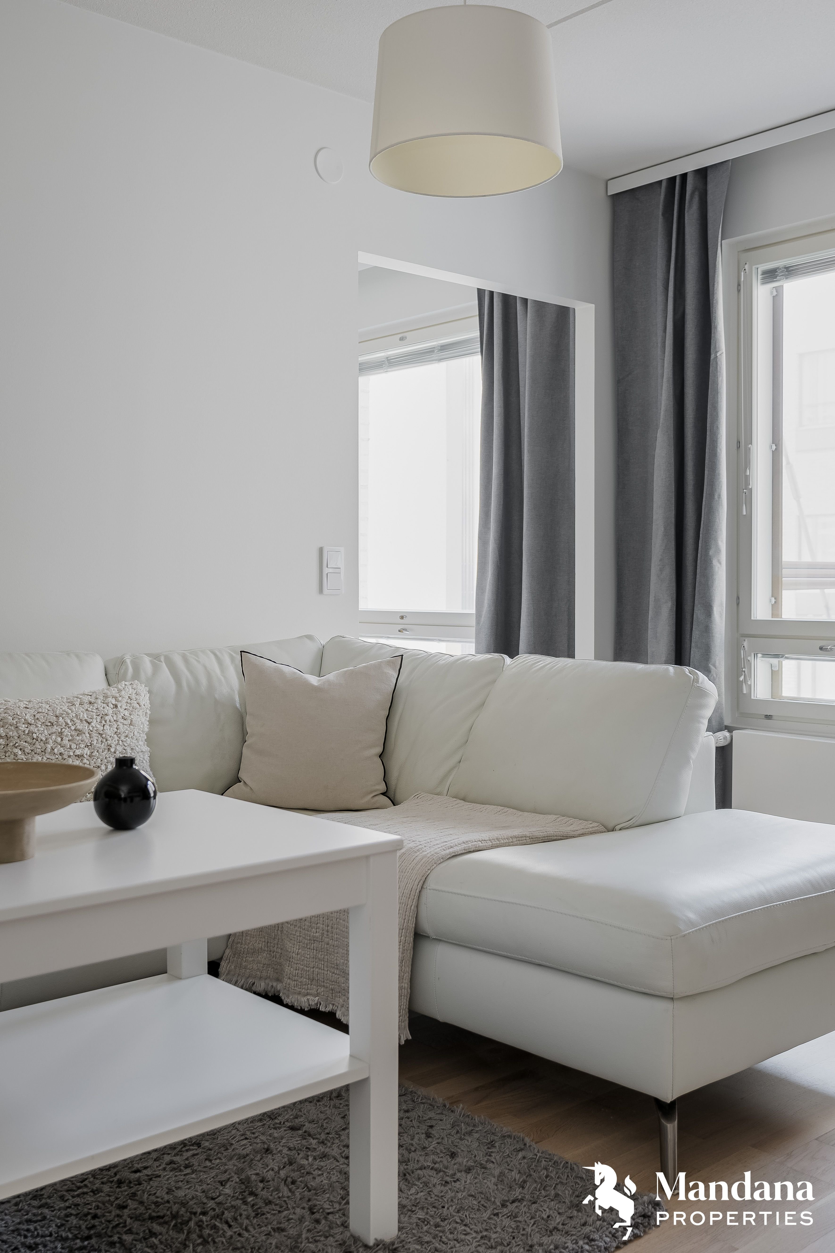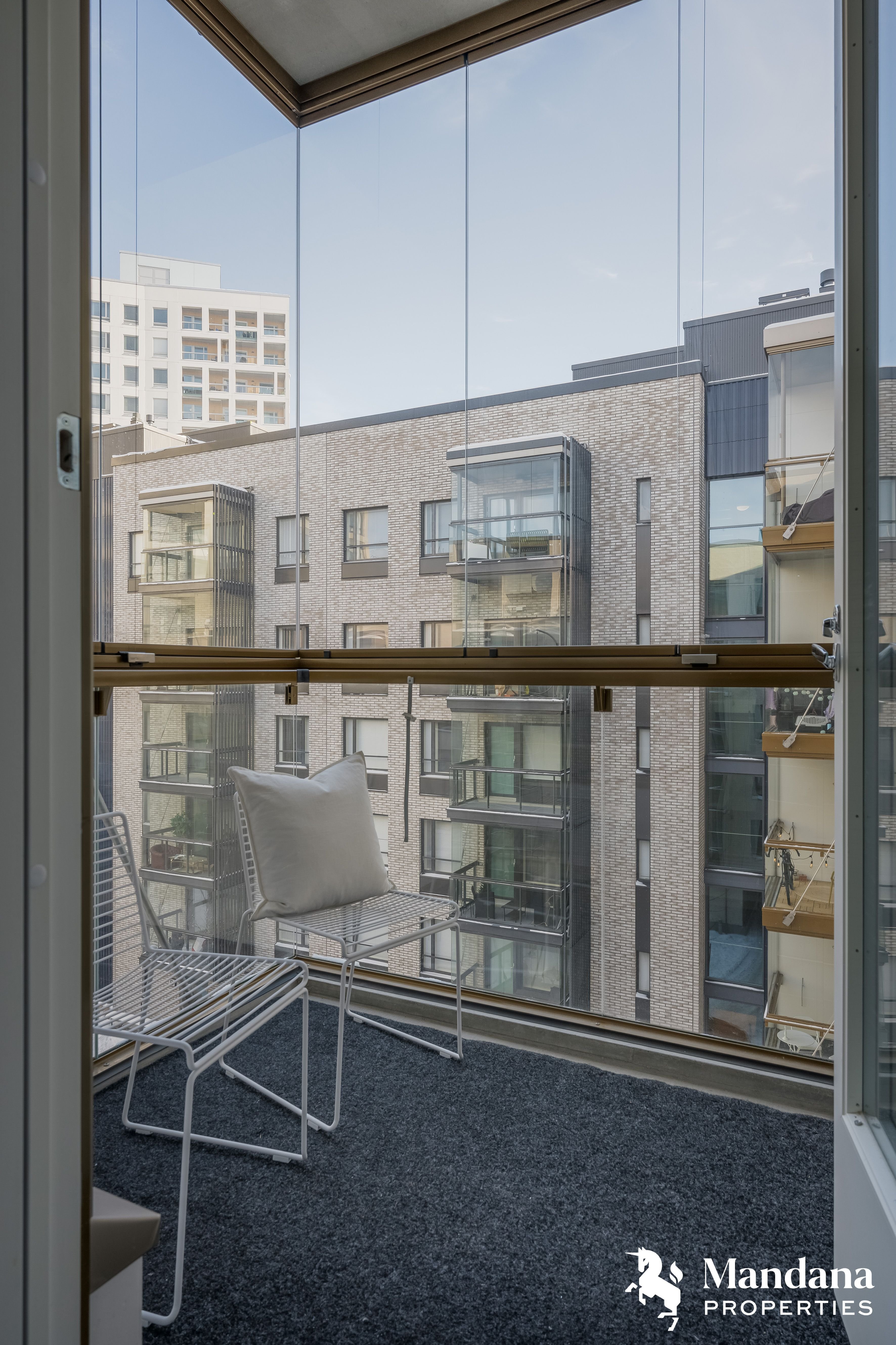 Viidennen kerroksen kaksio Jätkäsaaressa, jossa yhdistyvät kantakaupungin syke, merellisyys ja moderni asuminen. Avonainen olohuone ja keittiö muodostavat modernin ja avaran kokonaisuuden, josta on käynti lasitetulle parvekkeelle. Keittiö on varustettu laadukkailla integroiduilla kodinkoneilla ja kauniilla valkoisilla kaapistoilla. Makuuhuoneen yhteydessä on kätevä liukuovellinen vaatehuone, joka tarjoaa runsaasti säilytystilaa.