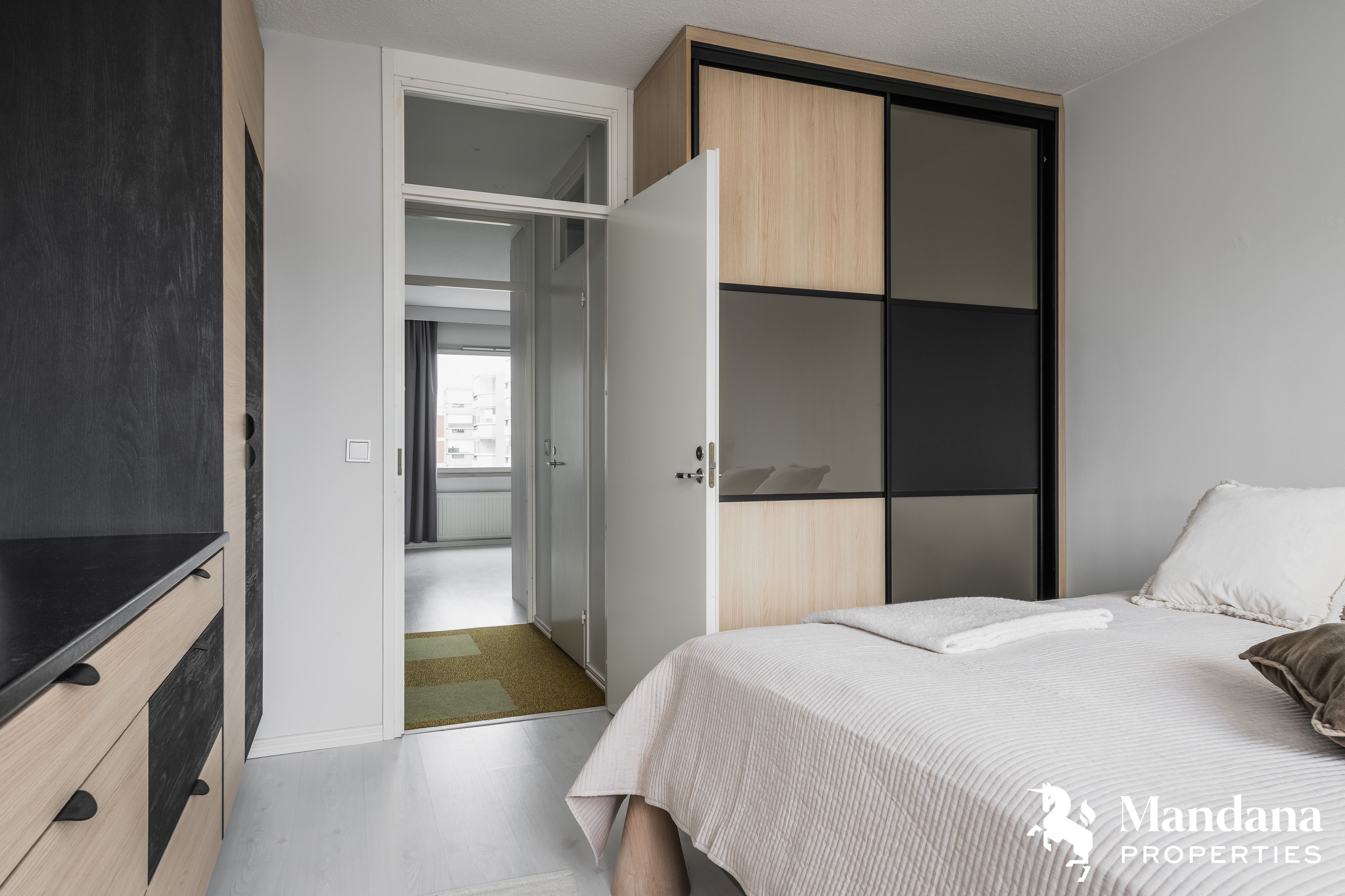 Tässä kolmannen kerroksen huoneistossa on kaksi makuuhuonetta sekä viihtyisä olohuone, josta on käynti lasitetulle parvekkeelle. Keittiö on varustettu laadukkailla Charmia-kalusteilla, integroiduilla kodinkoneilla ja kaasuliedellä. Kylpyhuone on uusittu vuonna 2024 linjasaneerauksen yhteydessä.