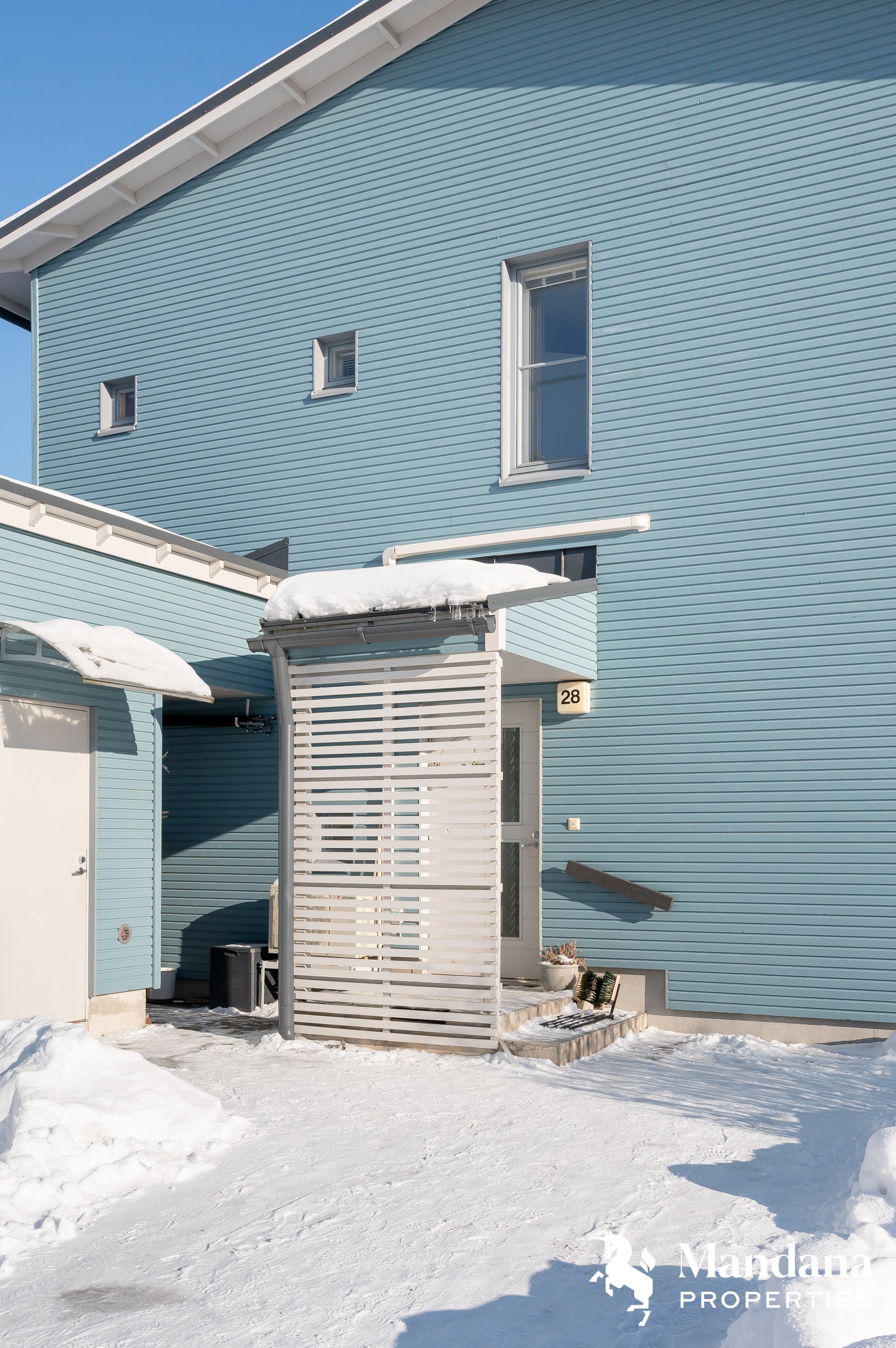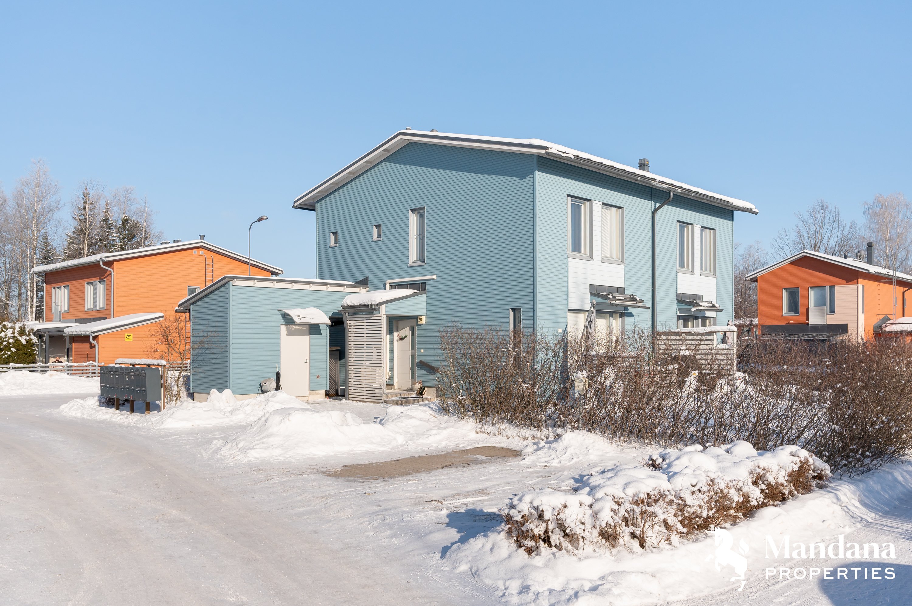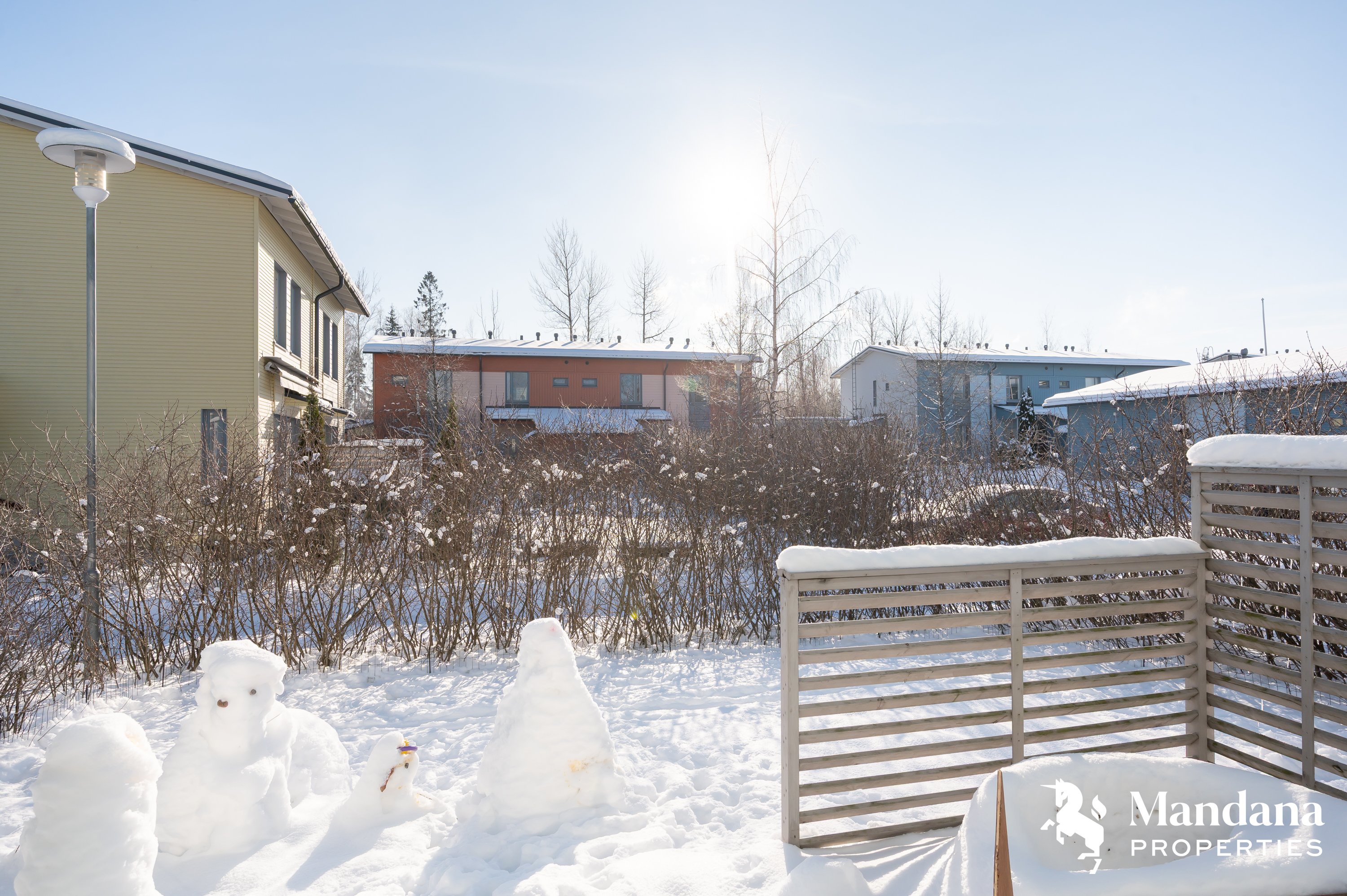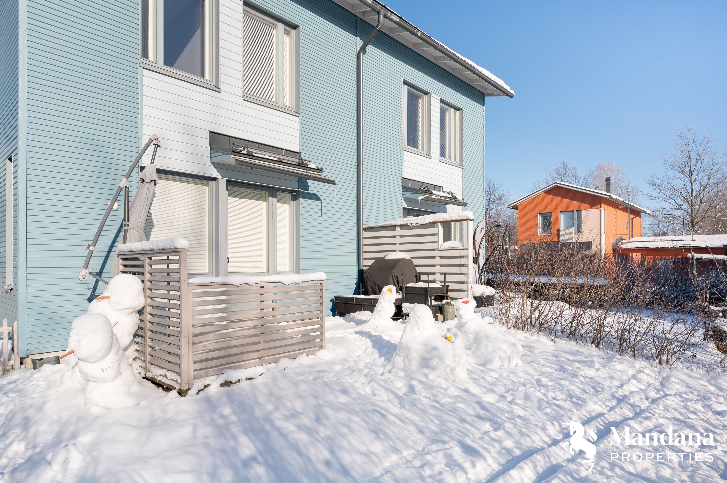 Suojaisalla takapihalla on tilava terassi, joka on ihanteellinen paikka nauttia kesäpäivistä. Etupihalla kaksi