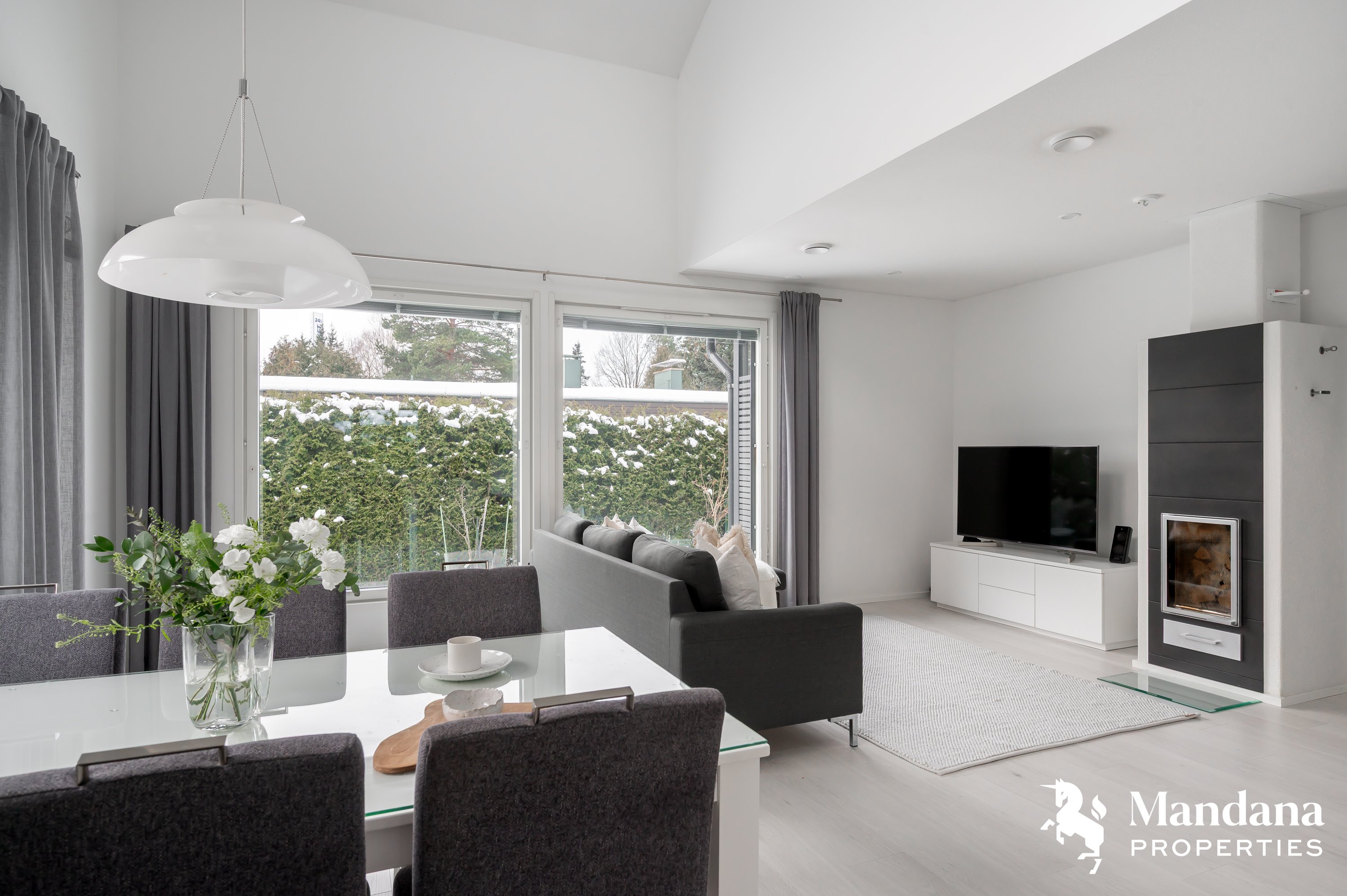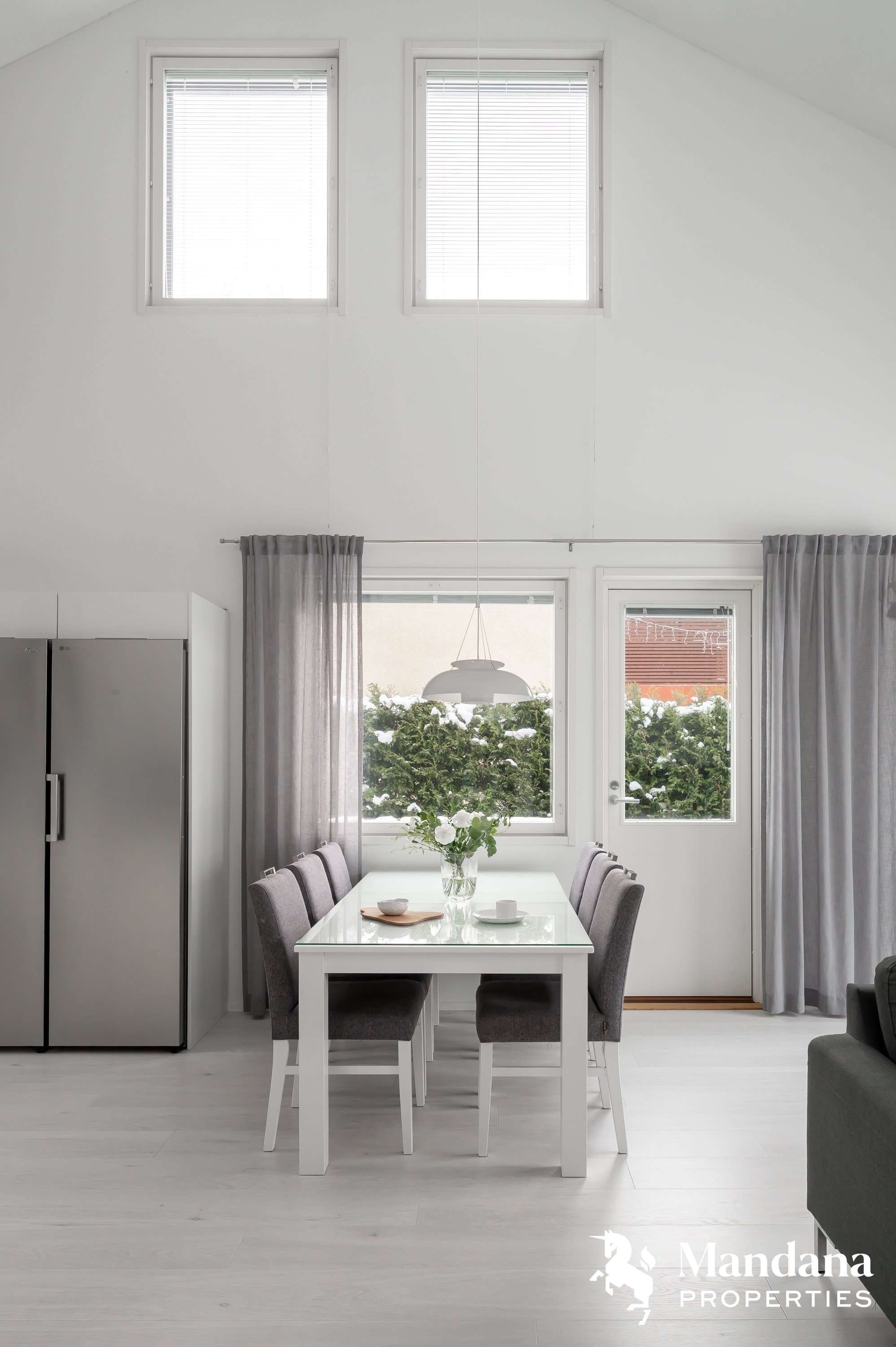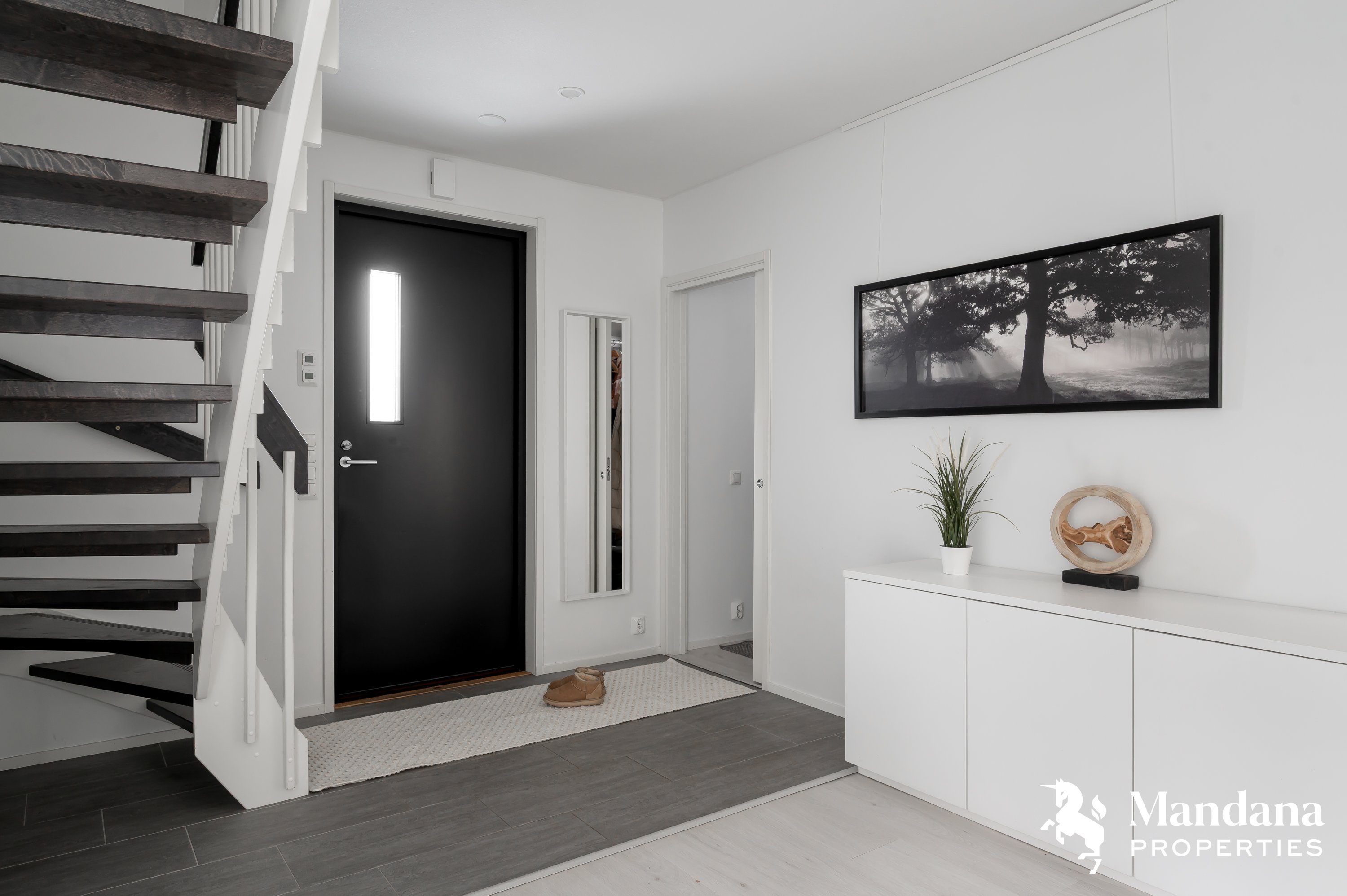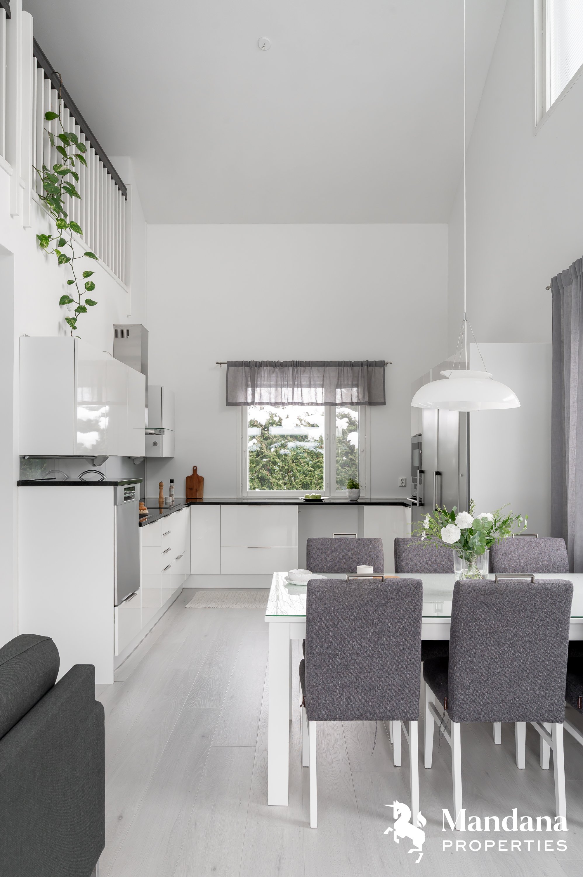 Kaunis omakotitalo on suunniteltu käytännöllisesti suuremmankin perheen tarpeisiin sopivaksi. Sisäänkäynti aukeaa tilavaan eteiseen, jonka yhteydessä on liukuovella erotettu arkieteinen. Ensimmäisessä kerroksessa on myös kodinhoitohuone, johon on suora kulku ulkoa. Olohuoneessa katse kiinnittyy hulppeaan huonekorkeuteen, sillä oleskelutilat avautuvat aina ylös asti ja suorastaan tulvivat valoa. Kaunis varaava takka on kuin kirsikka kakun päällä. Keittiö on varustettu nykyaikaisin, integroiduin kodinkonein ja vastaa varmasti vaativammankin kotikokin toiveisiin. Ensimmäisestä kerroksesta löytyy myös tämän kodin hulppean suuri master bedroom, jonka yhteydessä on niin ikään tilava vaatehuone.