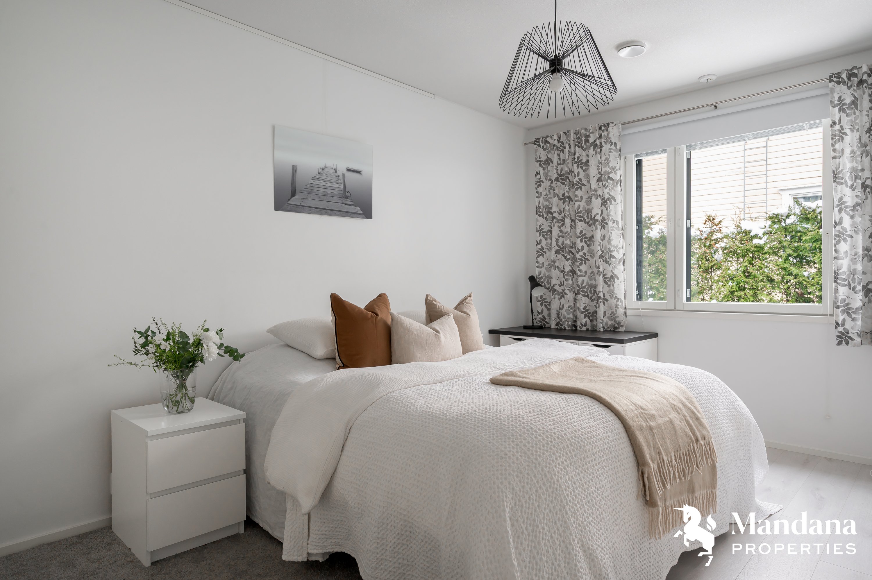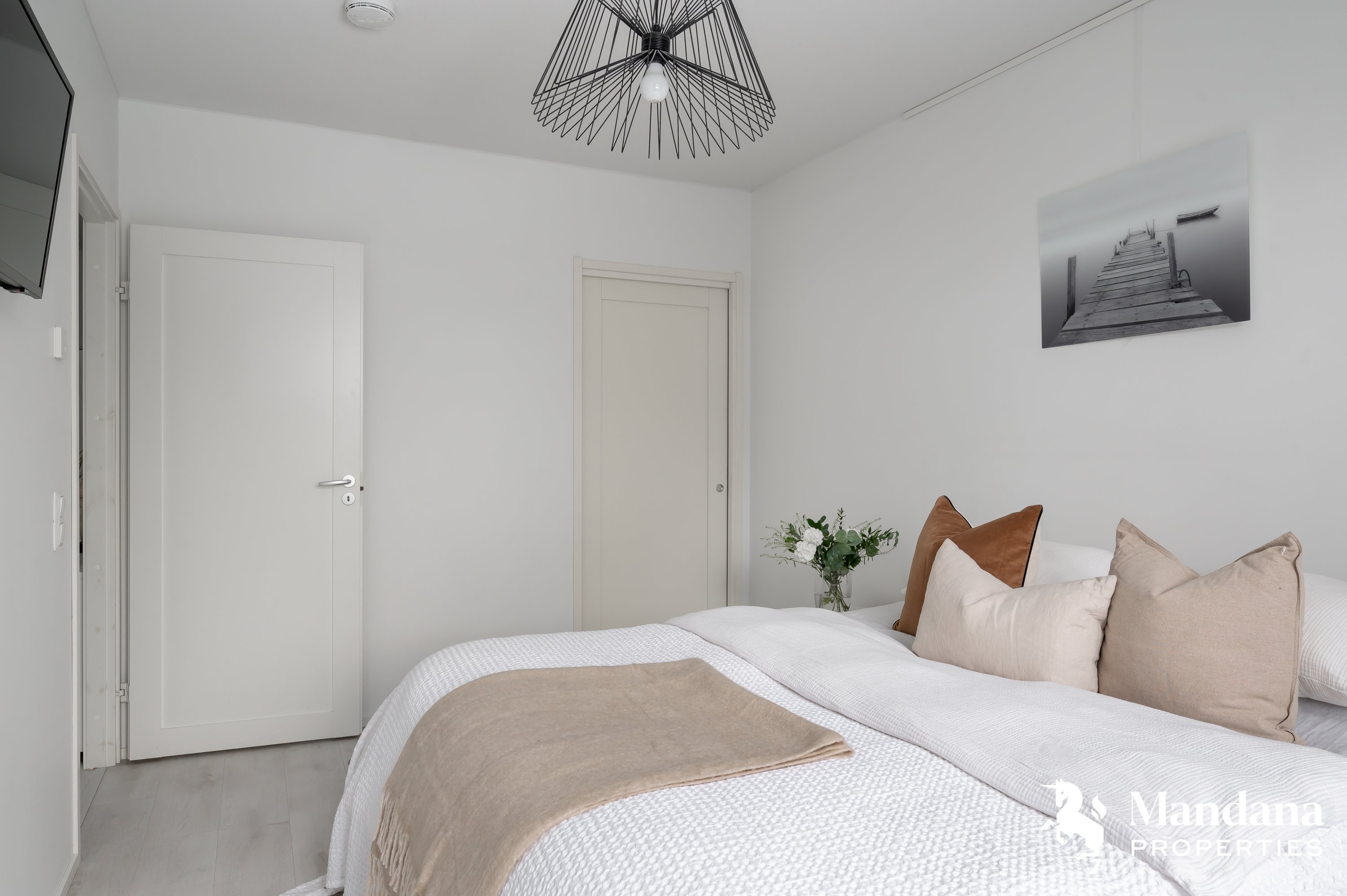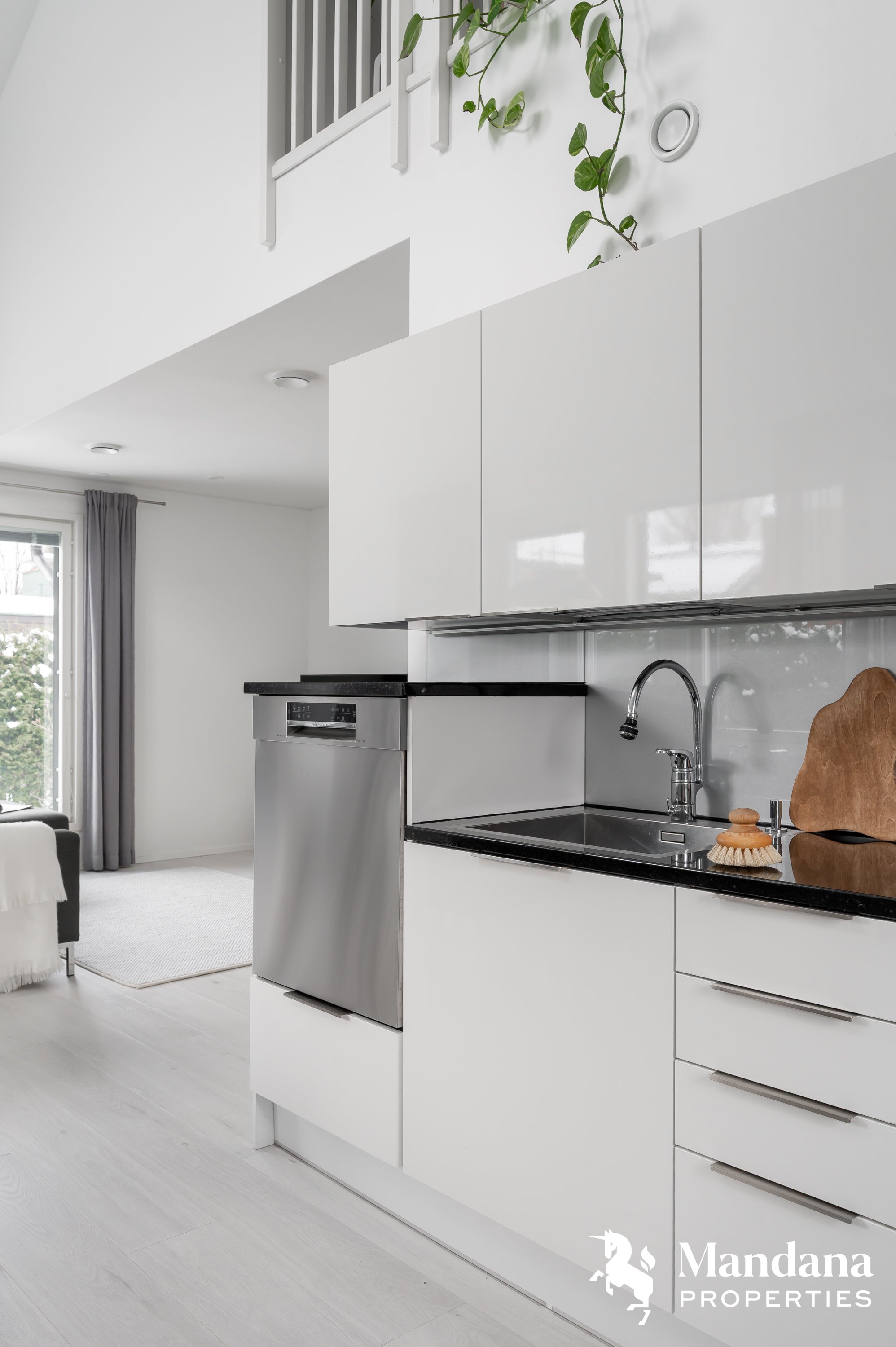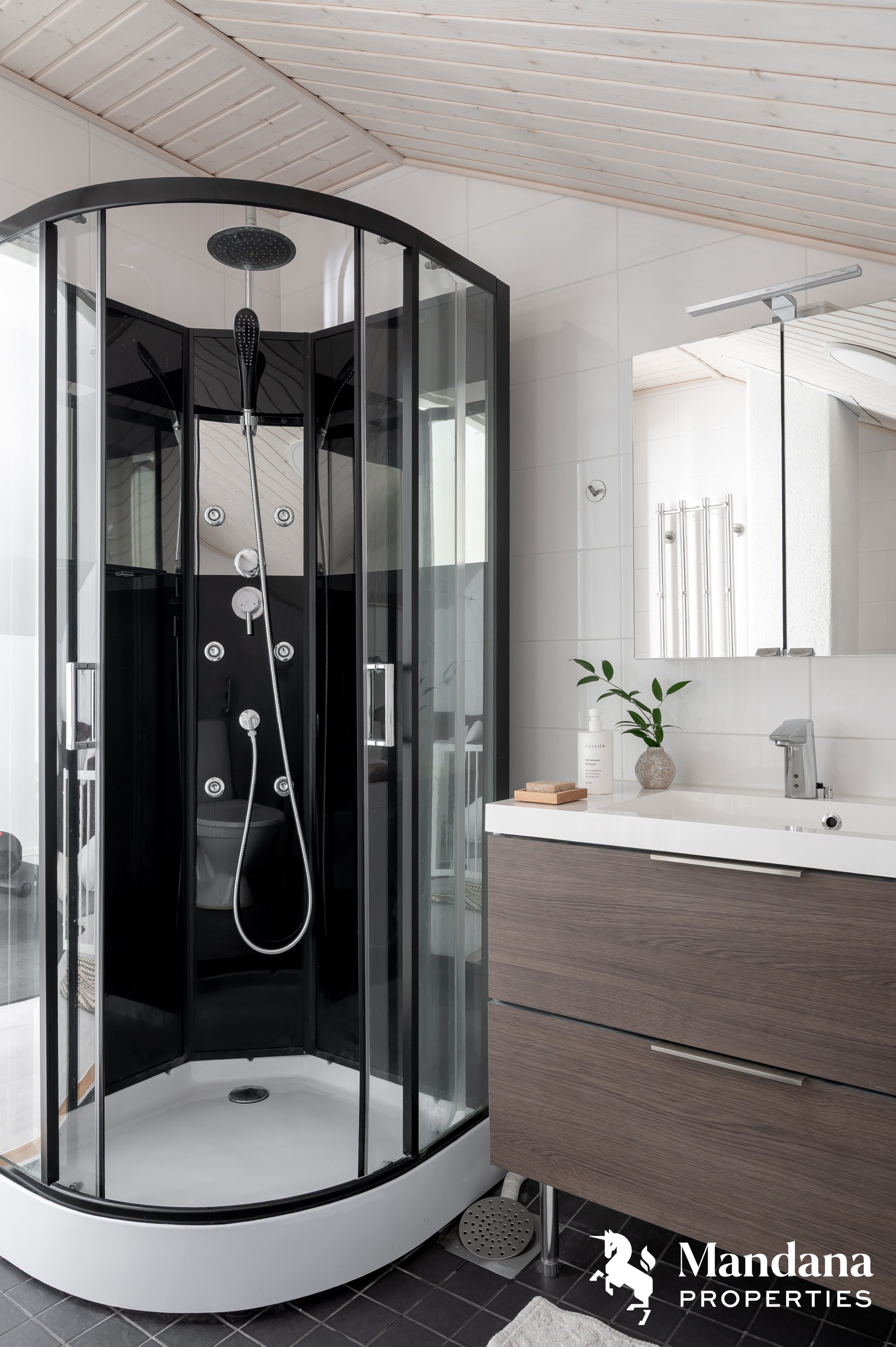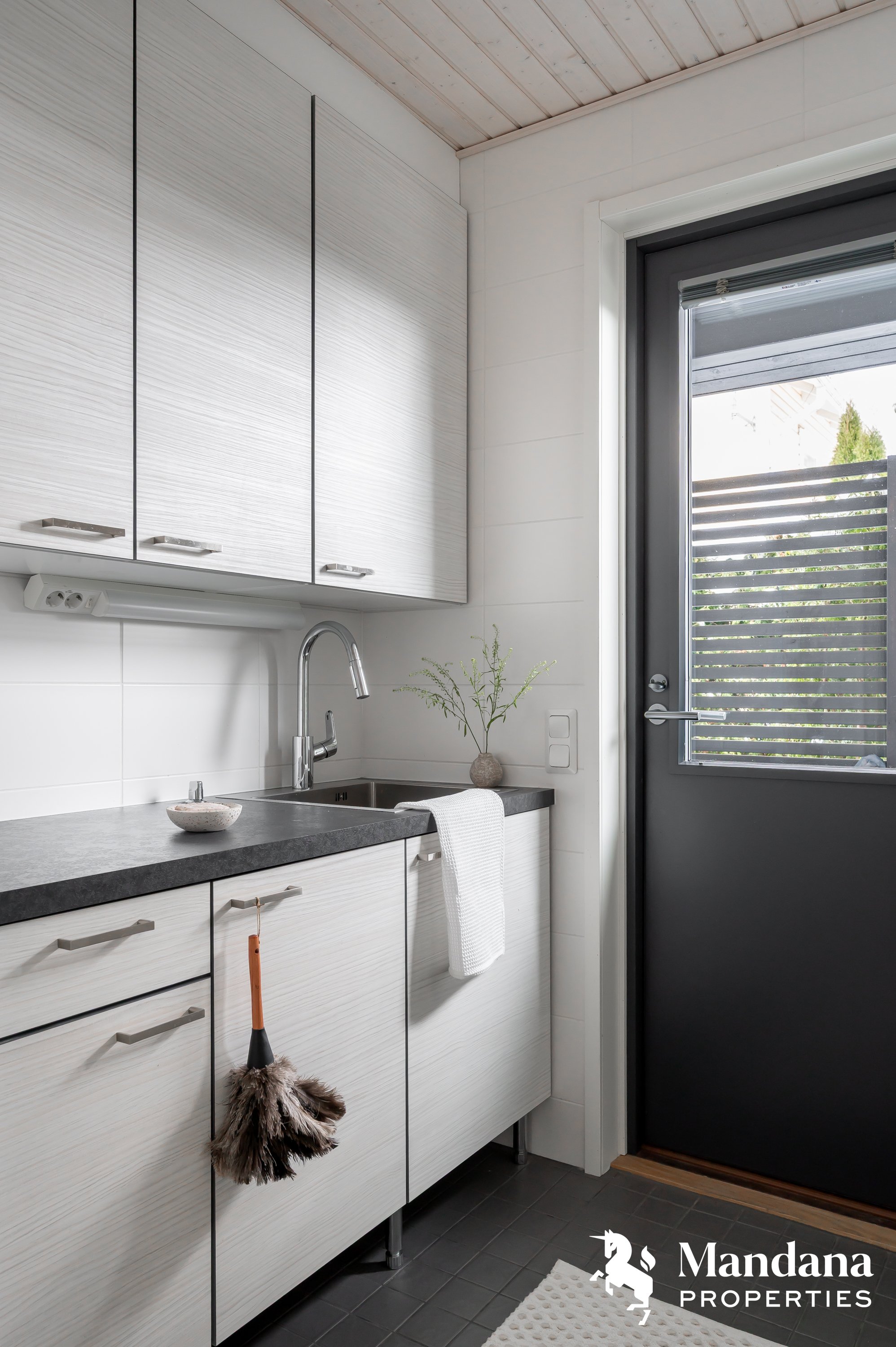Kaunis omakotitalo on suunniteltu käytännöllisesti suuremmankin perheen tarpeisiin sopivaksi. Sisäänkäynti aukeaa tilavaan eteiseen, jonka yhteydessä on liukuovella erotettu arkieteinen. Ensimmäisessä kerroksessa on myös kodinhoitohuone, johon on suora kulku ulkoa. Olohuoneessa katse kiinnittyy hulppeaan huonekorkeuteen, sillä oleskelutilat avautuvat aina ylös asti ja suorastaan tulvivat valoa. Kaunis varaava takka on kuin kirsikka kakun päällä. Keittiö on varustettu nykyaikaisin, integroiduin kodinkonein ja vastaa varmasti vaativammankin kotikokin toiveisiin. Ensimmäisestä kerroksesta löytyy myös tämän kodin hulppean suuri master bedroom, jonka yhteydessä on niin ikään tilava vaatehuone.