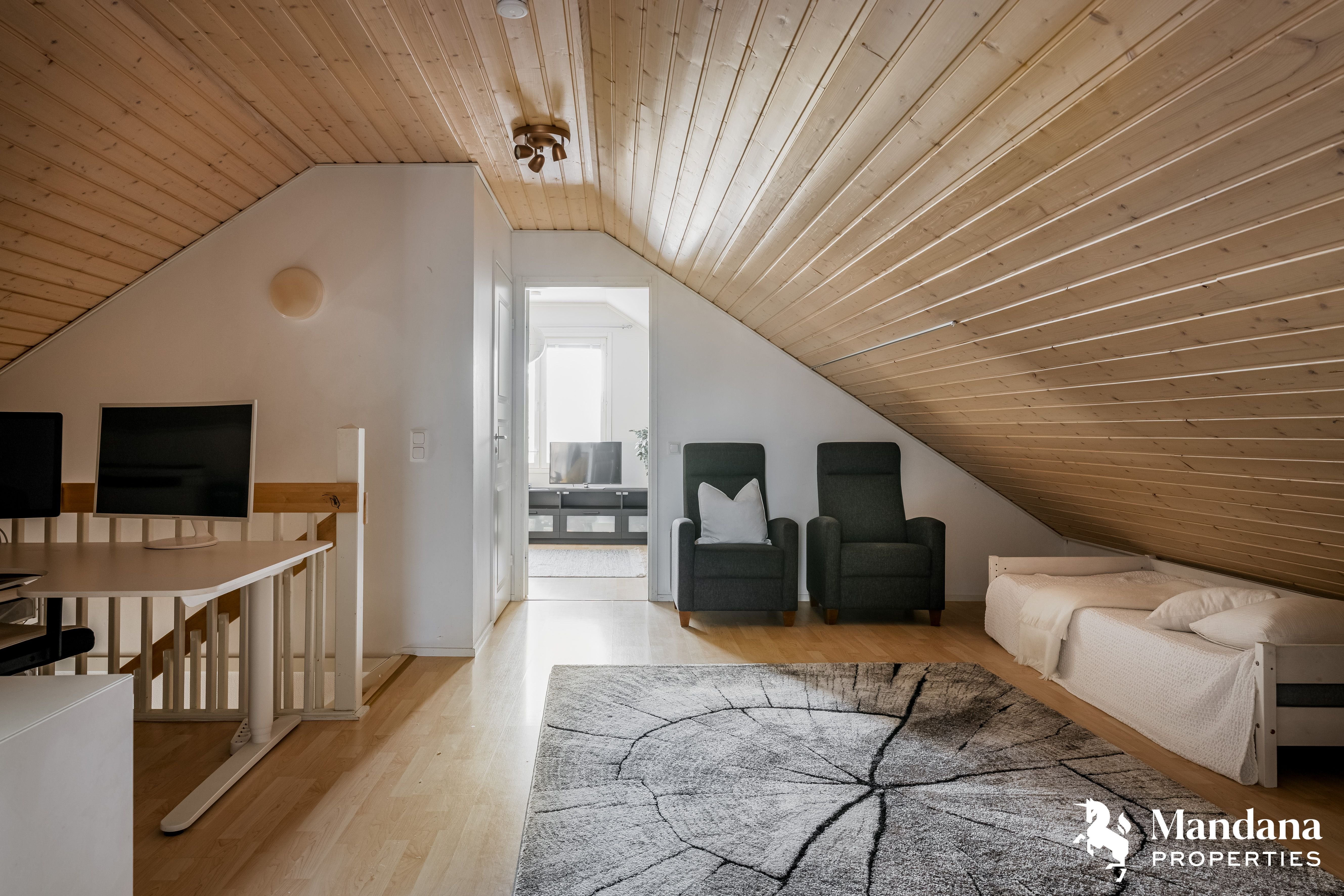 Asunnossa on neljä makuuhuonetta, jotka sijoittuvat kahteen kerrokseen. Tämä mahdollistaa rauhalliset nukkumatilat sekä joustavan tilankäytön eri elämäntilanteissa. Tilojen väljyyttä ja toimivuutta voi perustellusti pitää arjen todellisena mukavuutena – täällä on tilaa elää, olla ja hengittää. Lisäksi asunnossa on kaksi erillistä wc:tä.