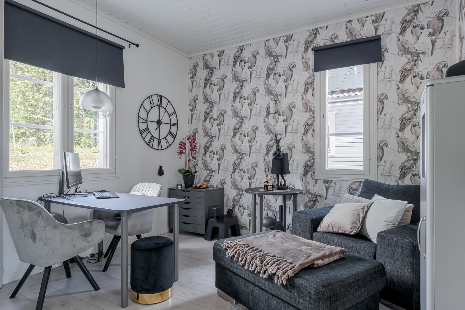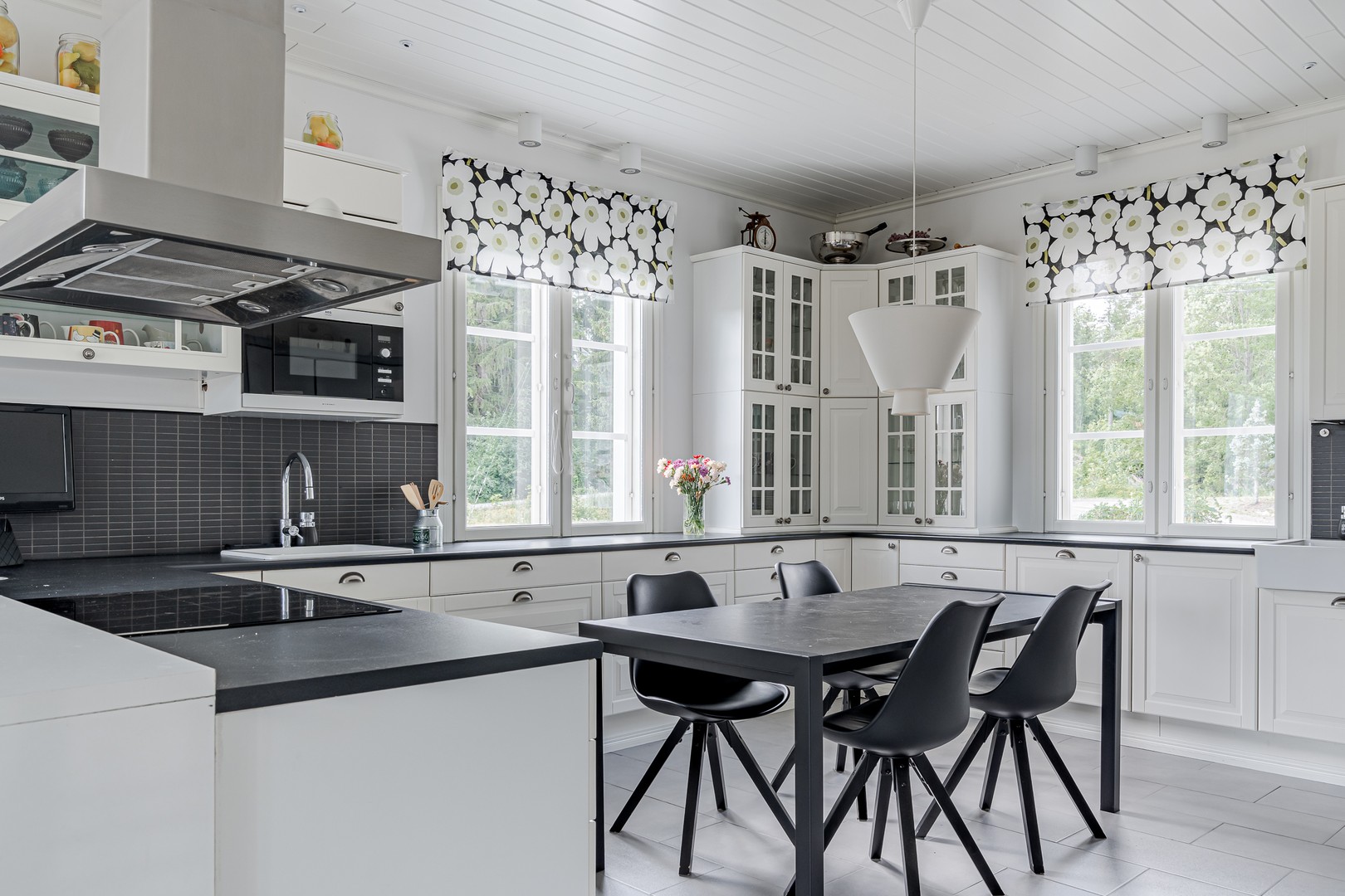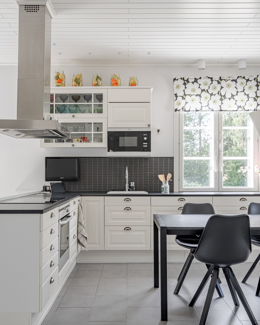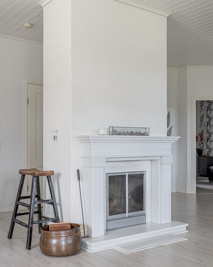 Suuret ikkunat tuovat runsaasti luonnonvaloa luoden avaran tunnelman, suurien terassien tarjotessa avoimet näkymät ympäröivään luontoon. Tilava olohuone, jossa varaava takka, on täydellinen paikka rentoutumiselle kylminä talvi-iltoina, ja vieressä oleva keittiö kattavin laittein antaa runsaasti tilaa kestittää ystäviä illallisten merkeissä.