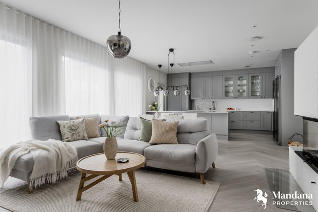 Eteisen korkea tila ja valaistut portaat tekevät sisääntulosta avaran ja kutsuvan. Kodin sydän on valoisa ja avara olohuone, joka yhdistyy saumattomasti hyvin varusteltuun keittiöön. Olohuoneessa on tunnelmaa luova takka, ja tilasta on kulku lasitetulle terassille. Pihalta löytyy lisäksi upotettu poreamme.